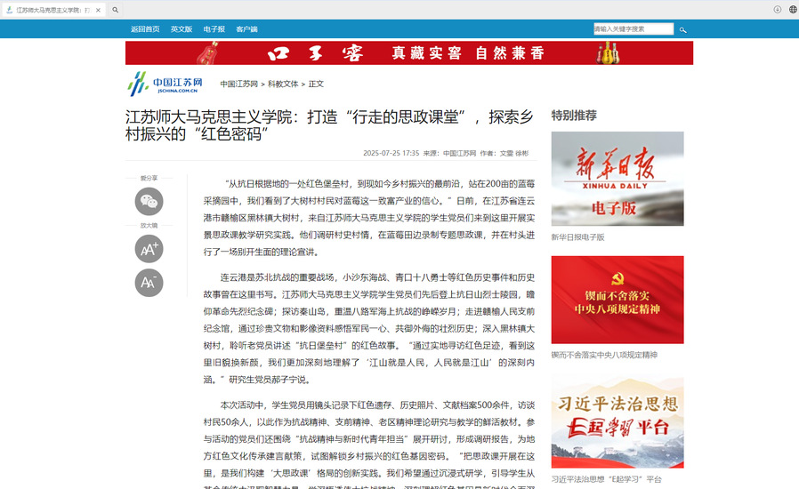 中国江苏网、交汇点新闻、全国高校思想政治工作网近日关注我校马克思主义学院暑期社会实践活动,报道内容如下:
