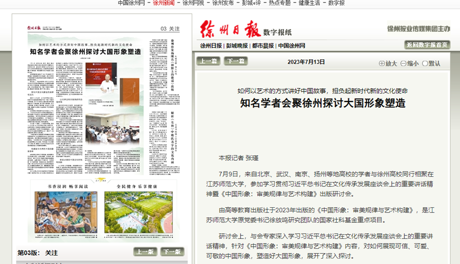 徐州日报7月13日报道我校举办的学习贯彻习近平总书记在文化传承发展座谈会上的重要讲话精神暨《中国形象:审美规律与艺术构建》出版研讨会,报道内容如下: