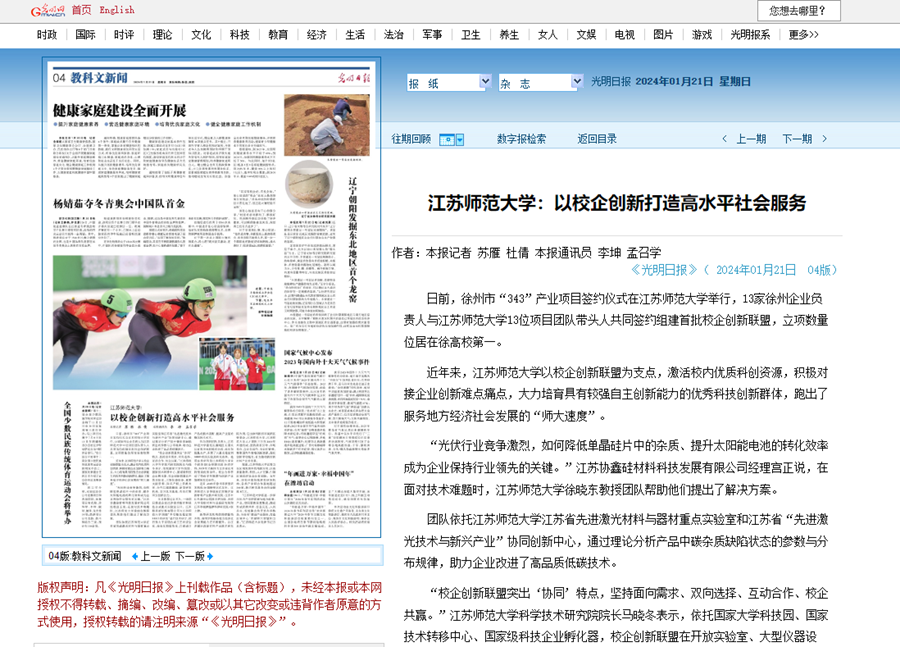 光明日报1月21日报道我校科研创新服务地方发展,报道内容如下: