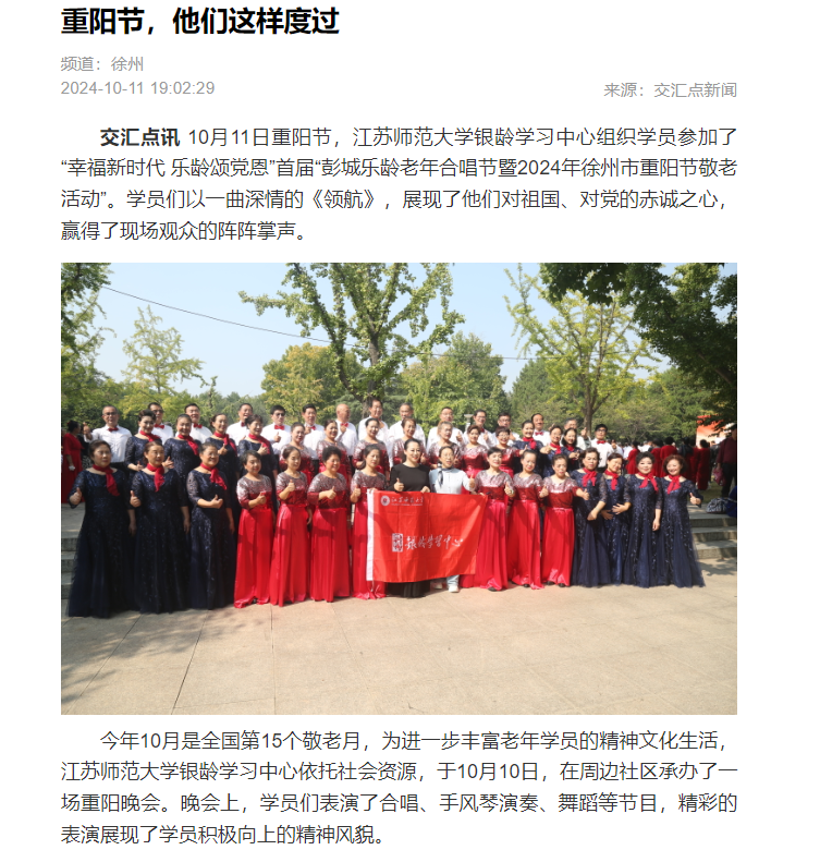 新华日报交汇点新闻10月11日报道我校银龄学习中心承办的“幸福新时代 乐龄颂党恩”首届“彭城乐龄老年合唱节暨2024年徐州市重阳节敬老活动”,报道内容如下: